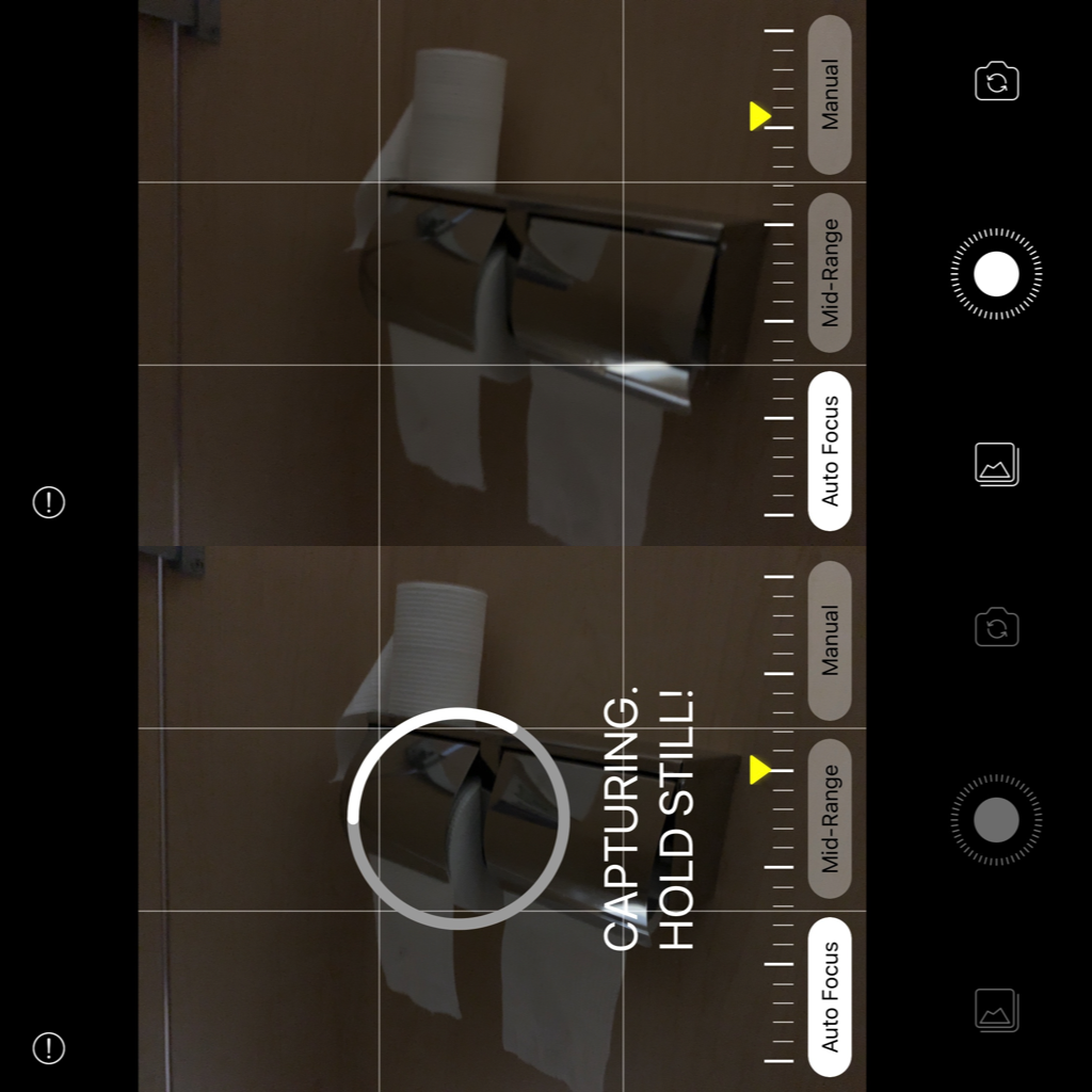 NeuralCam 앱을 실행하면 위사진처럼 되고 자동 초점이나 수동 초점을 선택하고 버튼을 누르면 아래 사진처럼 잠시 기달리라는 메시지가 나옵니다. 그리고 아이폰을 고정시키면서 몇초 기달리면 사진 촬영이 끝납니다.