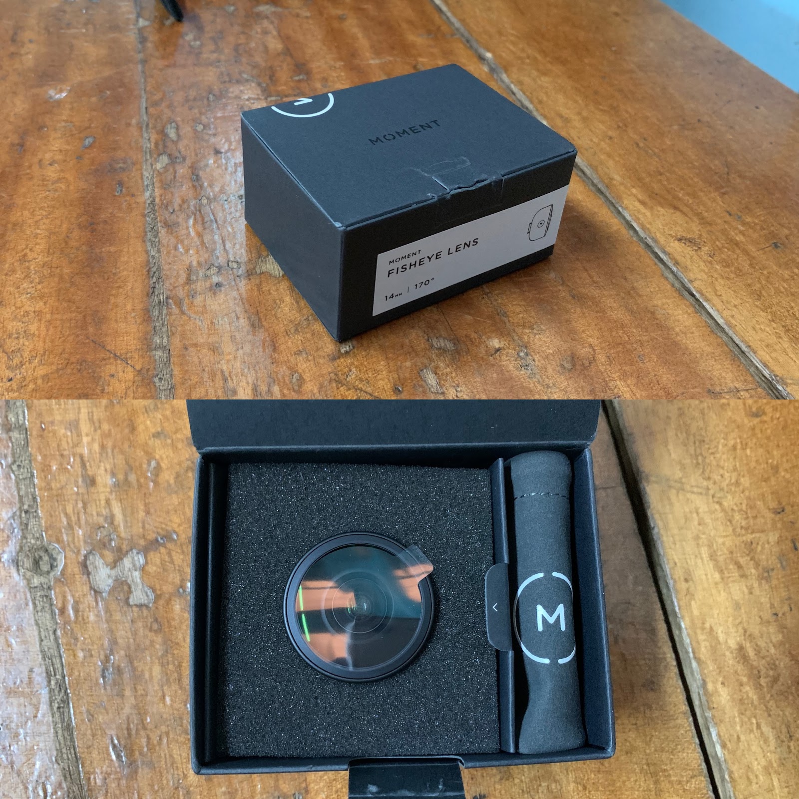 모멘트 14mm Fisheye 렌즈는 얇은 검은색 종이 박스에 포장되어 있는데 렌즈는 스폰지에 넣어져 있습니다.