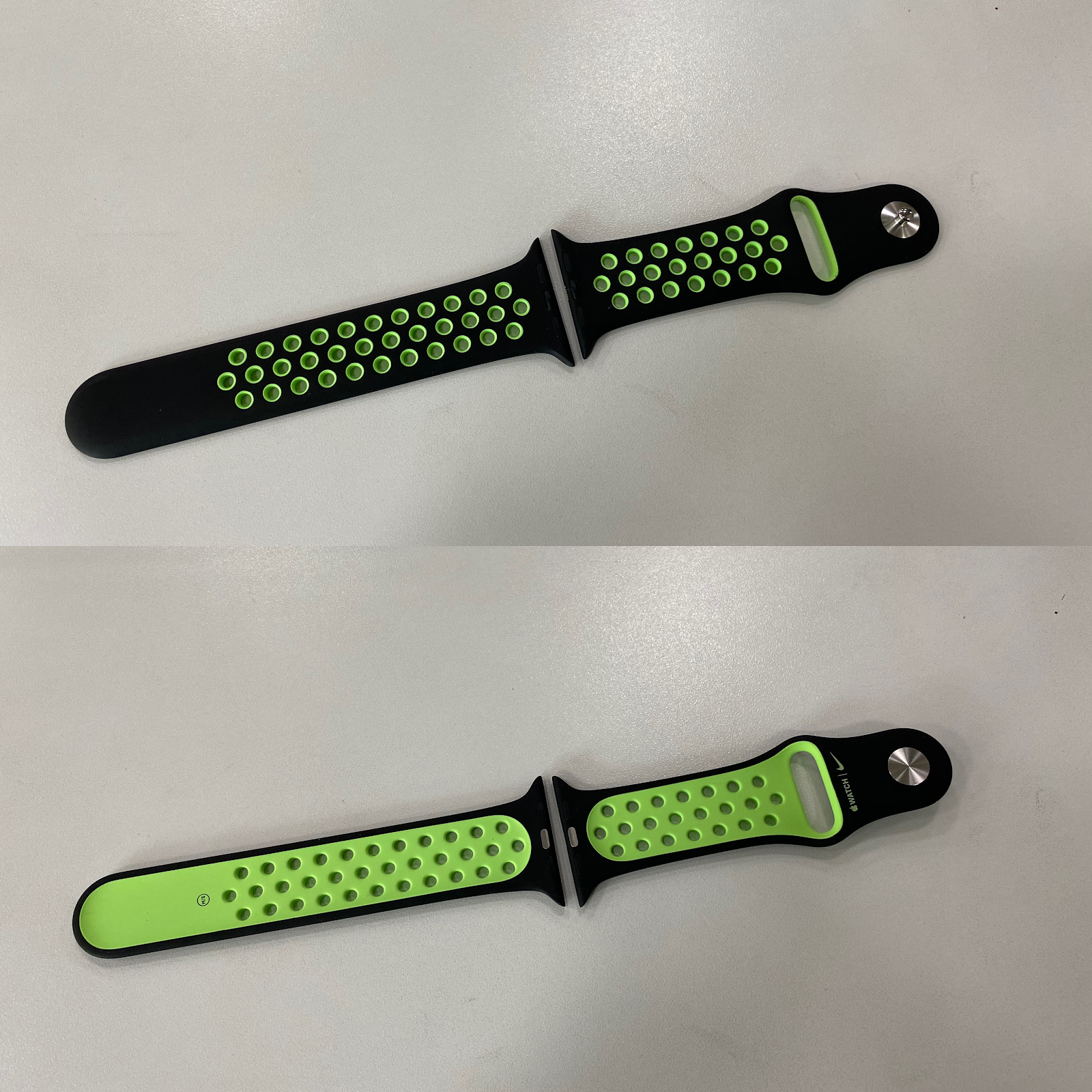 애플워치 나이키 스포츠 밴드는 탄력이 좋은 불화탄성중합체 재질로 만들어 졌고 외관은 검은색이며 안쪽은 라임 색상입니다. 또한 통기성을 위하여 작은 구멍들이 있습니다.
